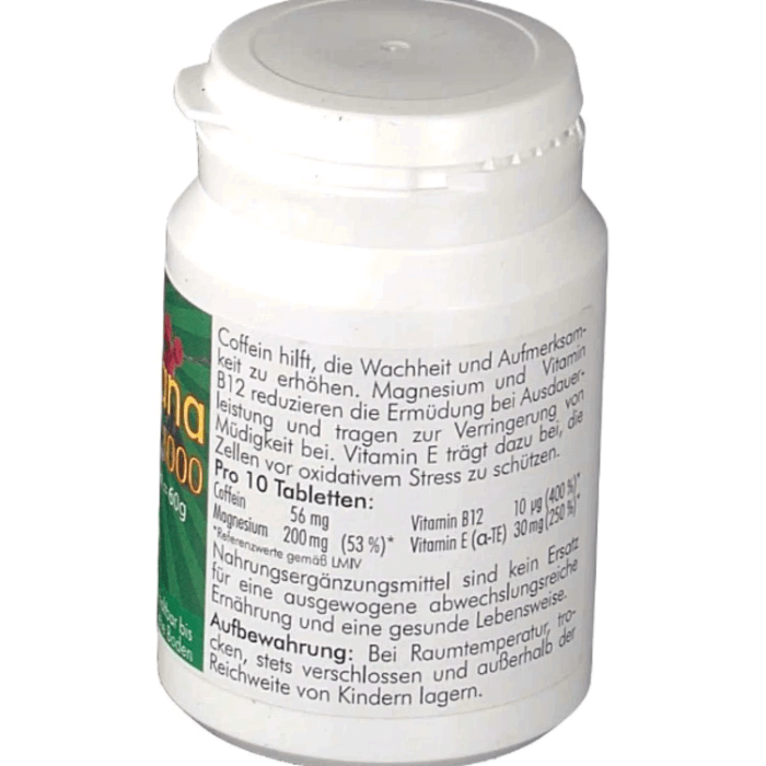 Жевательные таблетки Guarana 1000 - это стимулирующая пищевая добавка с декстрозой и порошком семян гуараны, содержащим кофе. Кофеин помогает повысить бдительность и настороженность. Магний и витамин B12 помогают уменьшить усталость и усталость. Витамин Е помогает защитить клетки от окислительного стресса.