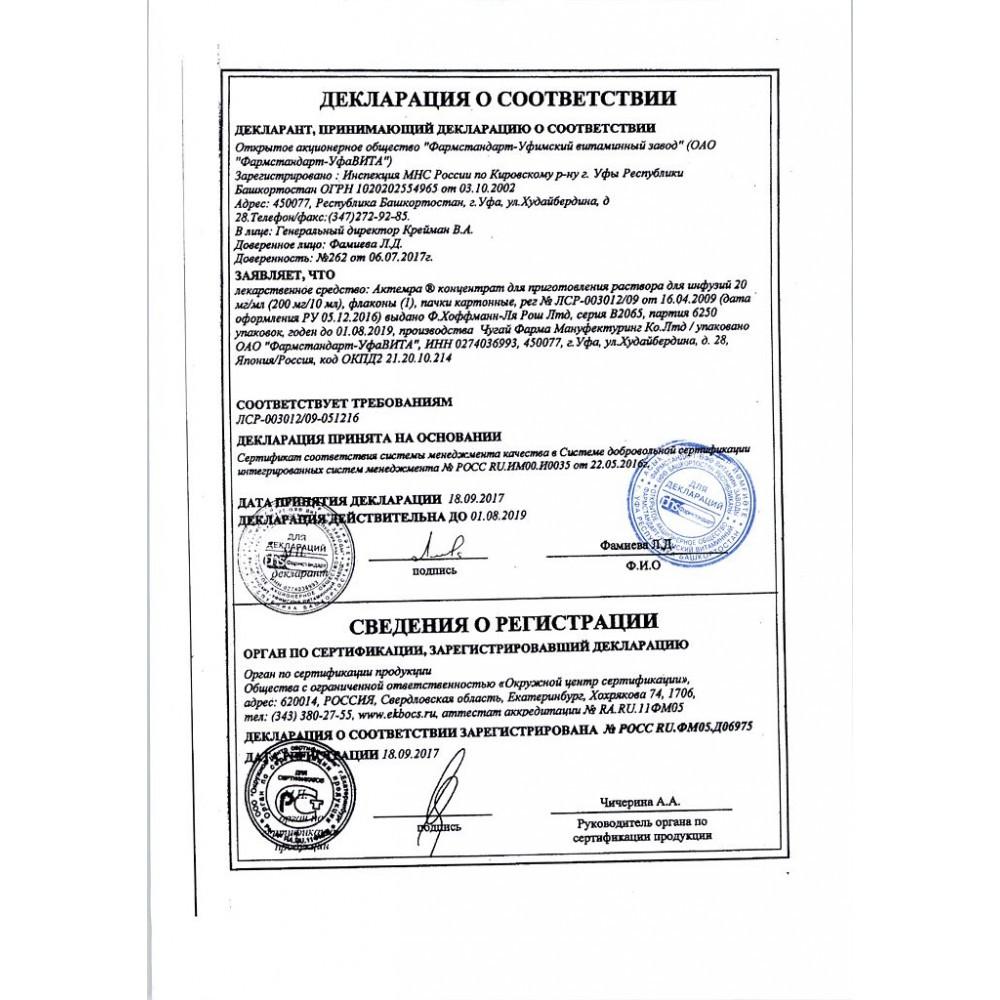 Частота серьезных реакций гиперчувствительности, связанных с инфузией Актемры, составила 0.3%. При появлении первых признаков анафилактической реакции необходимо назначить соответствующее лечение.
