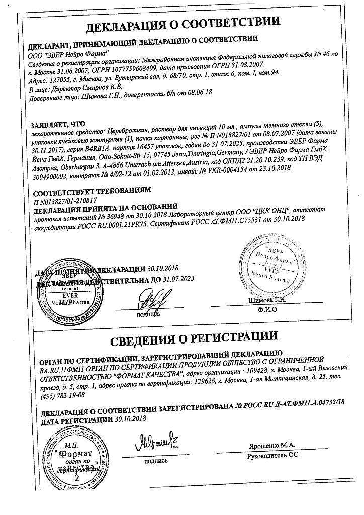Применение. Cerebrolysin используется внутримышечно и внутривенно. Доза, используемая при лечении, зависит от объекта заболевания. Обычно используются (ежедневные) дозы у взрослых: 10 мл - 50 мл (в 1 мл 215,2 мг активного ингредиента).