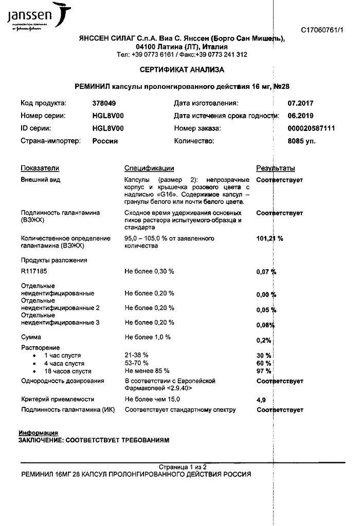 В сравнительном исследовании биодоступности препарата Реминил® в форме капсул с длительным высвобождением активного вещества, принимаемого в дозе 24 мг 1 раз в день, и в форме таблеток с немедленным высвобождением активного вещества, принимаемых в дозе 12 мг 2 раза в день, показана биоэквивалентность этих дозировок по показателям AUC0-24 ч и Cmin в равновесном состоянии. Cmax, достигаемая через 4.4 часа после приема капсул в дозе 12 мг 1 раз в день, была примерно на 24% меньше, чем после приема таблеток в дозе 12 мг 2 раза в день. Прием пищи не влиял на биодоступность препарата Реминил® в форме капсул с длительным высвобождением активного вещества в равновесном состоянии. В исследовании дозовой зависимости фармакокинетики препарата Реминил® в форме капсул с длительным высвобождением активного вещества у здоровых пожилых и молодых людей равновесная концентрация в плазме крови людей обеих возрастных групп достигалась в течение 6 дней при всех дозах (8, 16 или 24 мг). В обеих возрастных группах фармакокинетика в равновесном состоянии прямо зависела от дозы в исследованном диапазоне доз (8-24 мг).