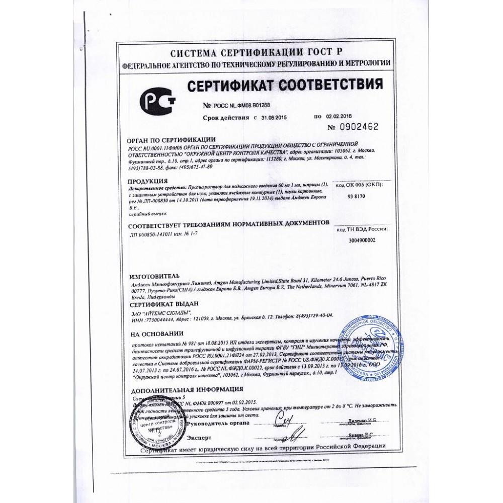 В одноразовом предварительно заполненном шприце (ПЗШ) 1 мл из стекла I гидролитического класса с иглой 27G из нержавеющей стали, эластомерным колпачком и эластомерным плунжером, ламинированным фторполимером (с защитным устройством для иглы или без него). Маркированный шприц помещают в пачку картонную.