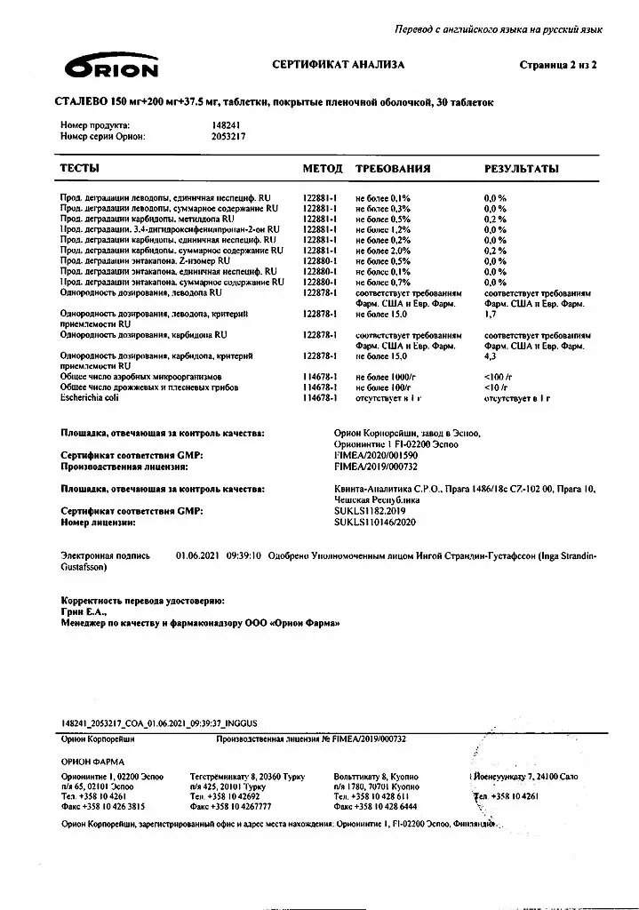 Лечение: принимаемые меры при острой передозировке препарата Сталево схожи с таковыми при острой передозировке леводопы. Пиридоксин как антидот препарата Сталево неэффективен. Рекомендована госпитализация с проведением общедетоксикационных мероприятий, промывание желудка и многократный прием активированного угля. Данные меры предназначены для ускорения элиминации энтакапона из организма, в частности путем снижения всасывания/реабсорбции вещества из ЖКТ. Следует проводить меры по поддержанию нормальной работы дыхательной системы, ССС, а также работы почек. При необходимости назначают соответствующие мероприятия, направленные на поддержание жизненно важных органов и систем.