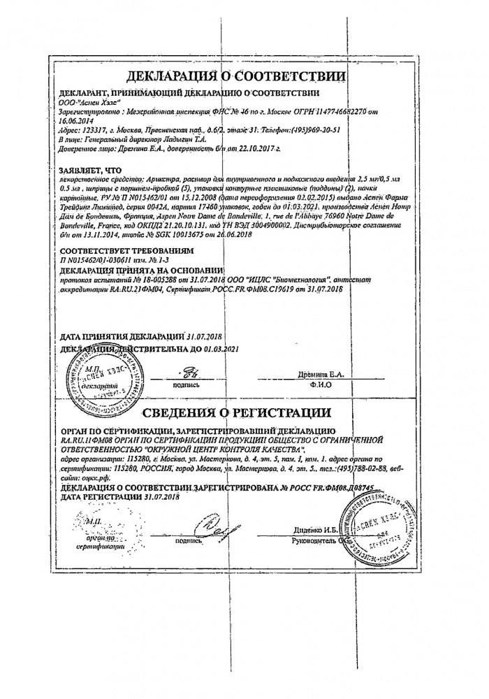 Препарат Арикстра предназначена только для п/к и в/в (стартовая доза у пациентов при инфаркте миокарда с подъемом сегмента ST) применения. Не применять в/м!