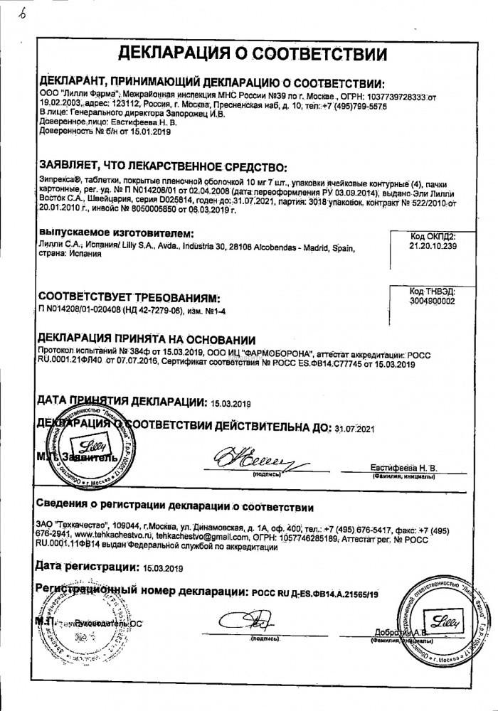 Применение. Таблетки Зипрекса принимают внутрь, независимо от приема пищи. Начальная доза — от 10 мг/сут, однократно. Затем суточная доза может варьироваться — от 5 до 20 мг/сут, в зависимости от клинического состояния.
