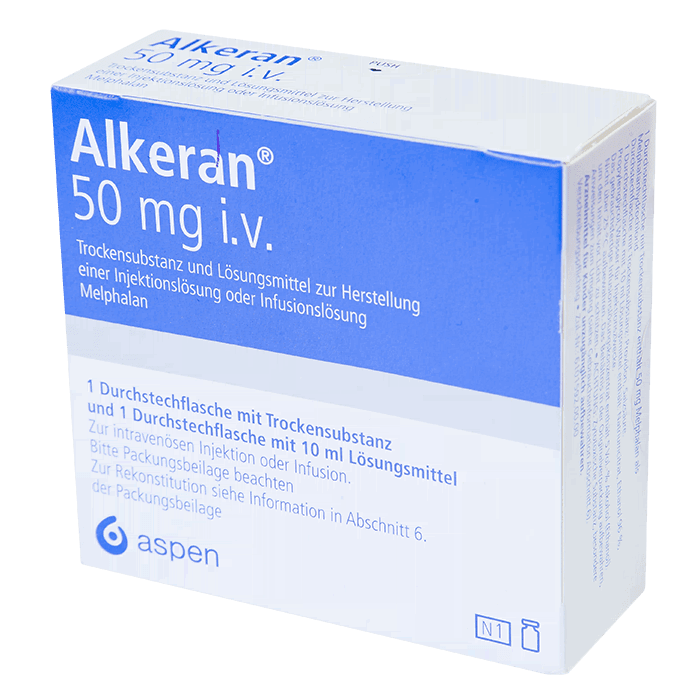 В/в введение Алкерана в виде монотерапии или в комбинации с другими цитотоксическими препаратами также эффективно при множественной миеломе, как и пероральный прием Алкерана. В/в введение Алкерана в высоких дозах (с трансплантацией гемопоэтических стволовых клеток или без нее) в качестве первой линии терапии или для консолидации ремиссии после стандартной цитостатической химиотерапии приводит к полной ремиссии у 50% пациентов с множественной миеломой.
