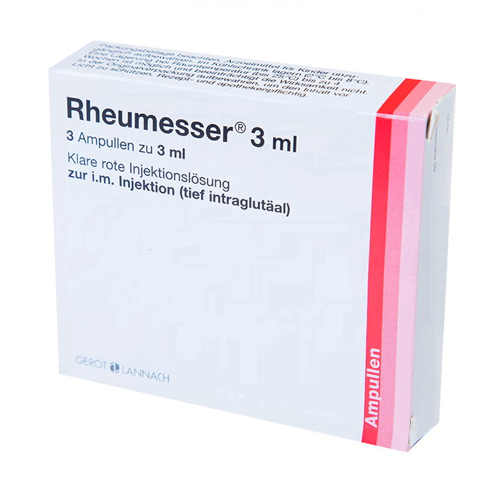 Rheumesser ( Роймессер) болеутоляющее и противовоспалительное средство,ампула с 3 ml раствора. l доступен в фирменных упаковках с 1 ампулой, 3 ампулами и 9 ампулами.
