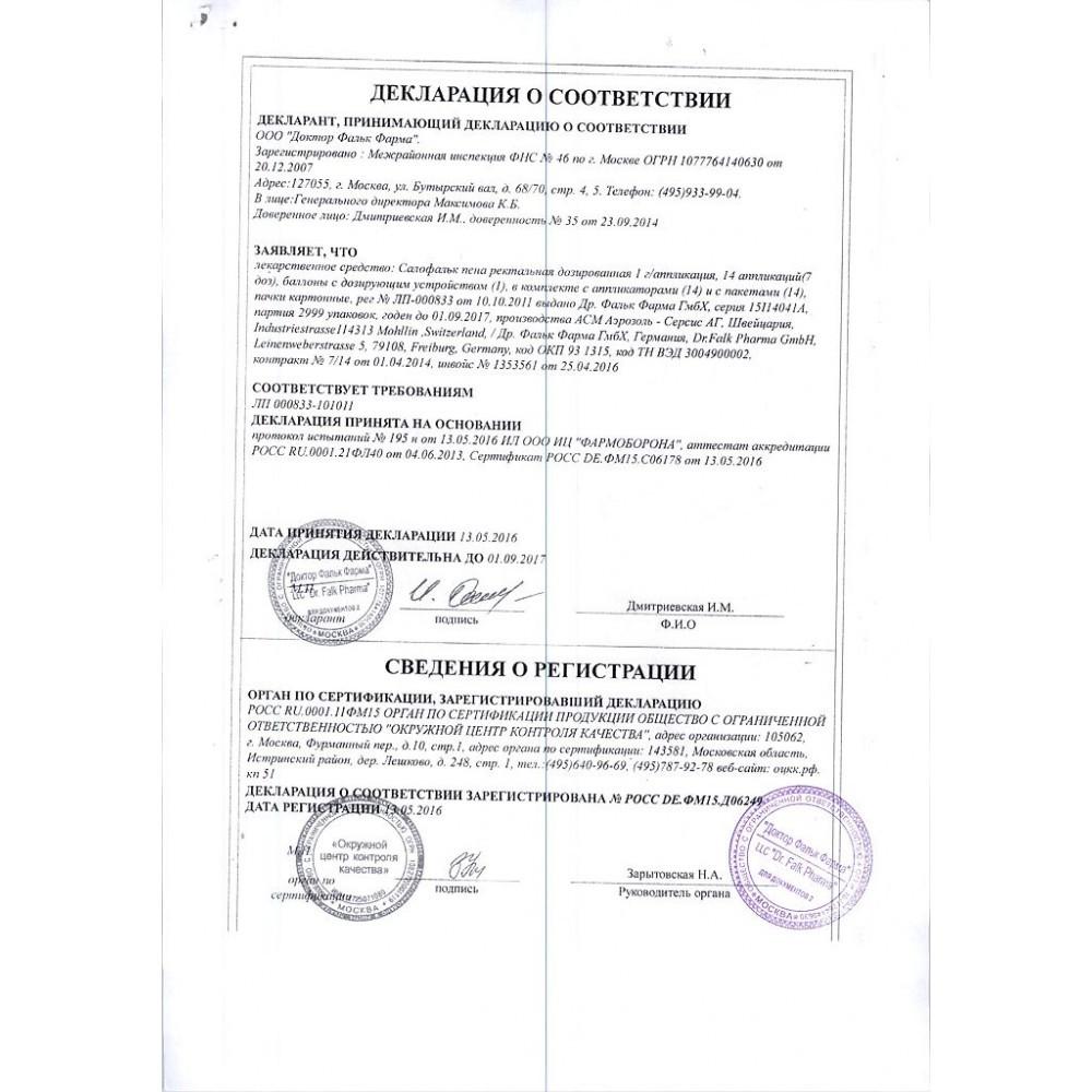 Применение. Салофальк в форме пены применяют ректально взрослым и детям старше 12 лет обычно назначают 1 раз/сут перед сном (1 доза соответствует 2 аппликациям/нажатиям.